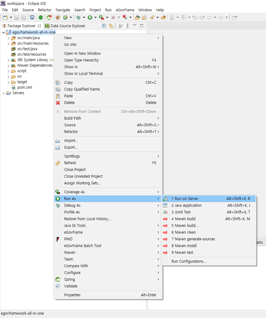공통컴포넌트를 설치한 프로젝트 내에 위치한 “globals.properties” 파일의 정보를 바꿔야 한다.(globals.properties 파일의 위치: src/main/resources > egovframework > egovProps > globals.properties을 확인한다.) 해당 properties 파일에 수동으로 정보를 입력한다. 그리고 maven clean, maven install을 한 후 run as-run on server 를 실행한다.